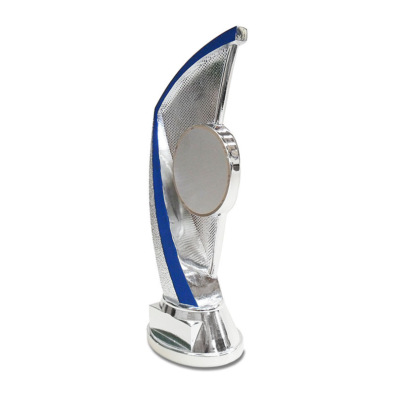 Trofeo a forma di vela in resina metallizzata predisposto per doppia personalizzazione, misure prodotto 31x12,5 cm